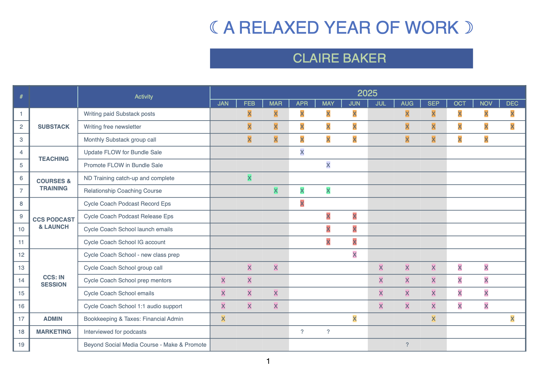 To map out your more creative chapters, simmer seasons and fallow phases, you can use a very simple spreadsheet I call the “Relaxed Year of Work.”